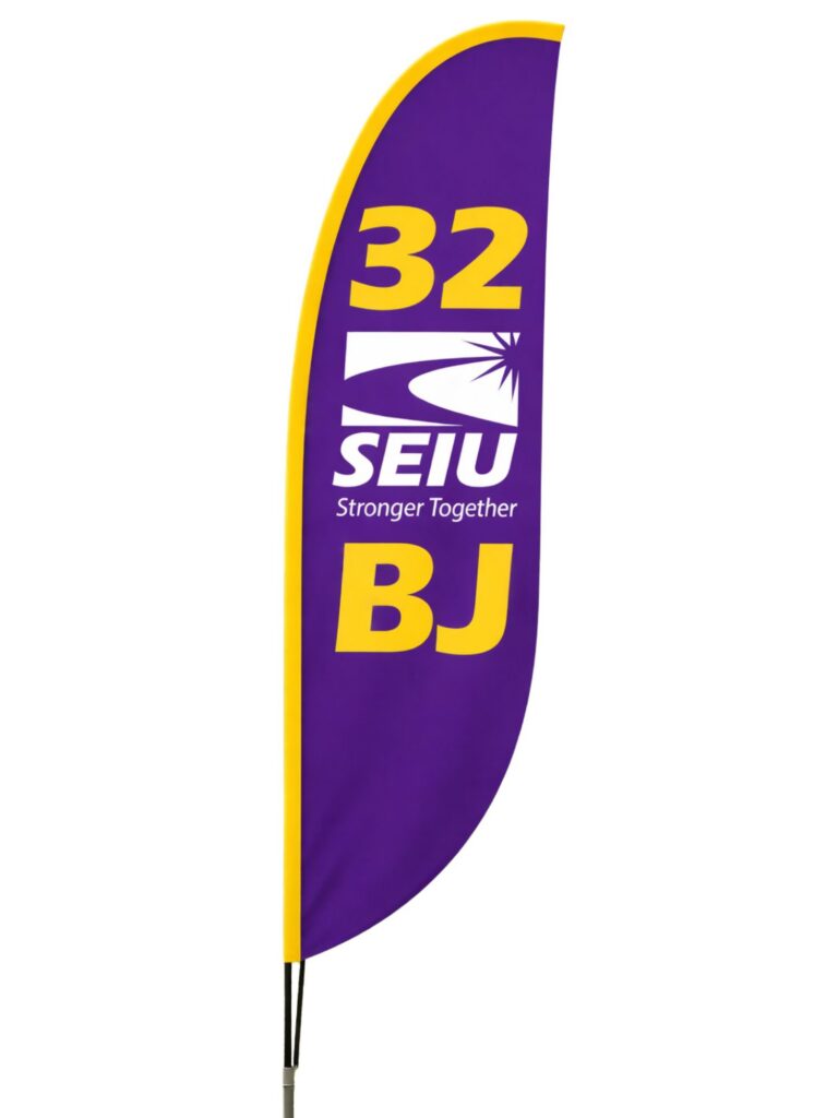 10' feather flag with SEIU 32BJ Logo, comes with ground stake. Product time is 3 weeks.